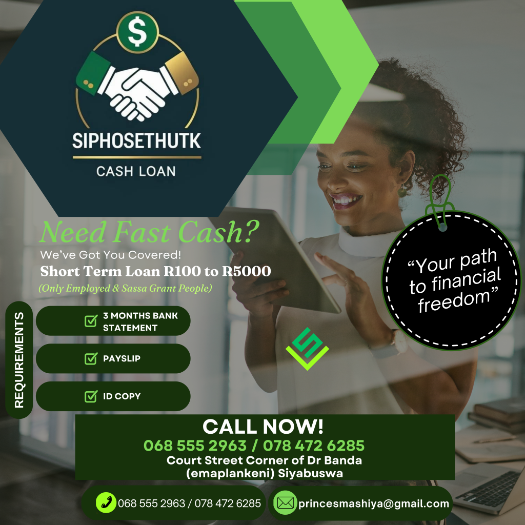 SiphosethuTK Cash Loan specializes in short-term personal loans ranging from R100 to R5,000 at a 35% interest rate.